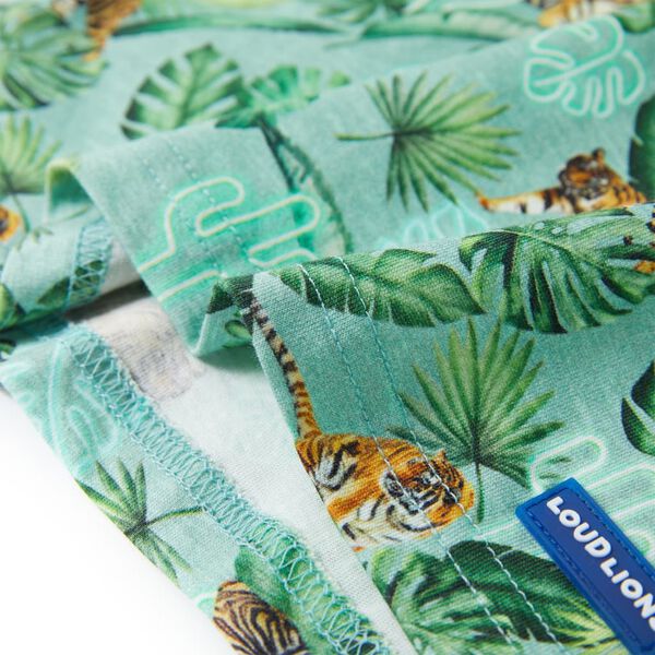 Esta camiseta para niños tiene manga corta, cuello redondo y corte recto. Esta camiseta tiene tigres y plantas estampados por toda la prenda. La camiseta infantil de manga corta está hecha 100% de algodón peinado, tratado con un lavado de silicona y enzimas para que tenga un tacto suave y agradable.