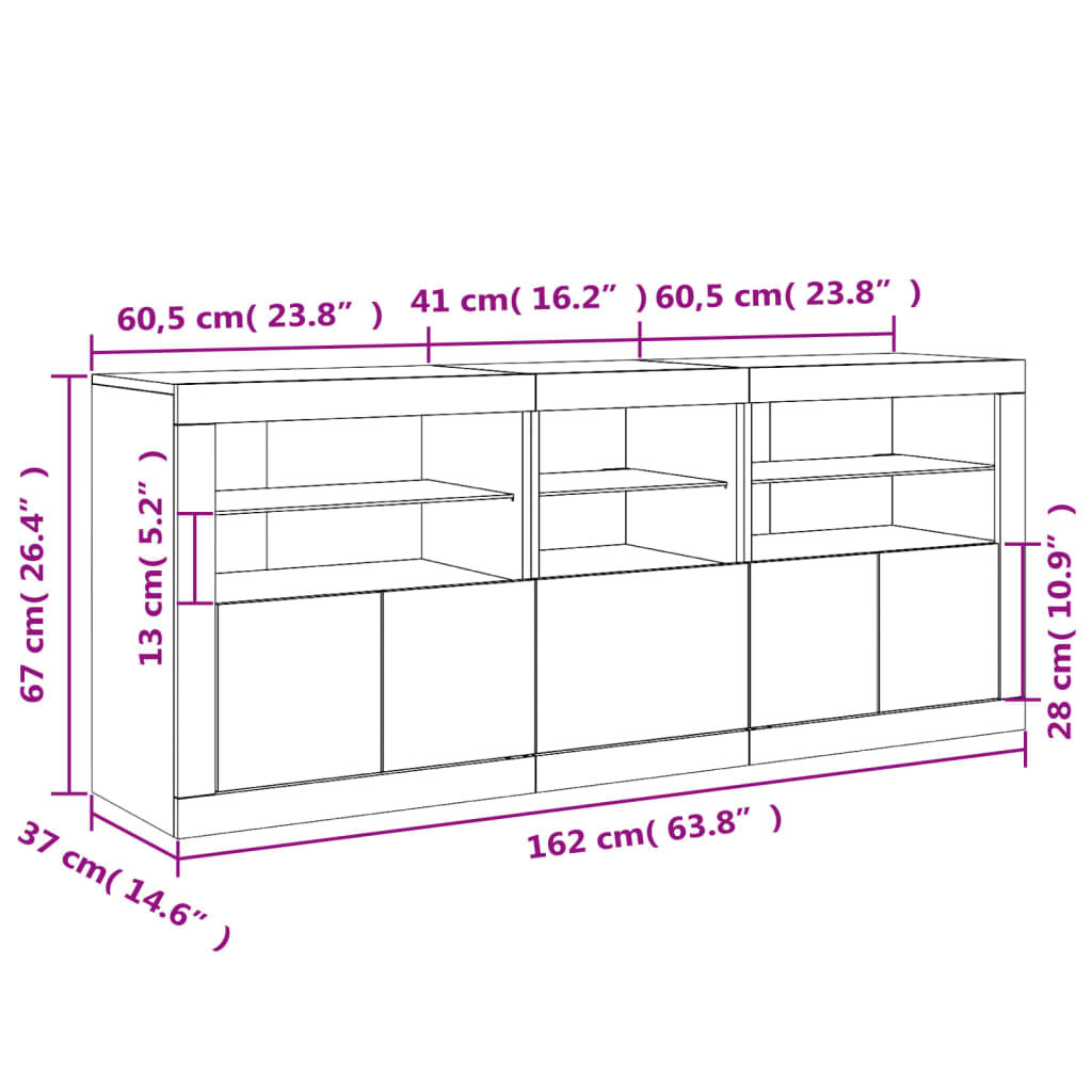 • Luces LED RGB: El armario buffet está equipado con brillantes luces LED RGB. Con diversos menús personalizables, puedes cambiar el color de las luces sin problemas e incluso hacer que se ajusten automáticamente. Estas luces LED no sólo realzan el aspecto moderno del aparador, sino que también le dan un toque de moda.