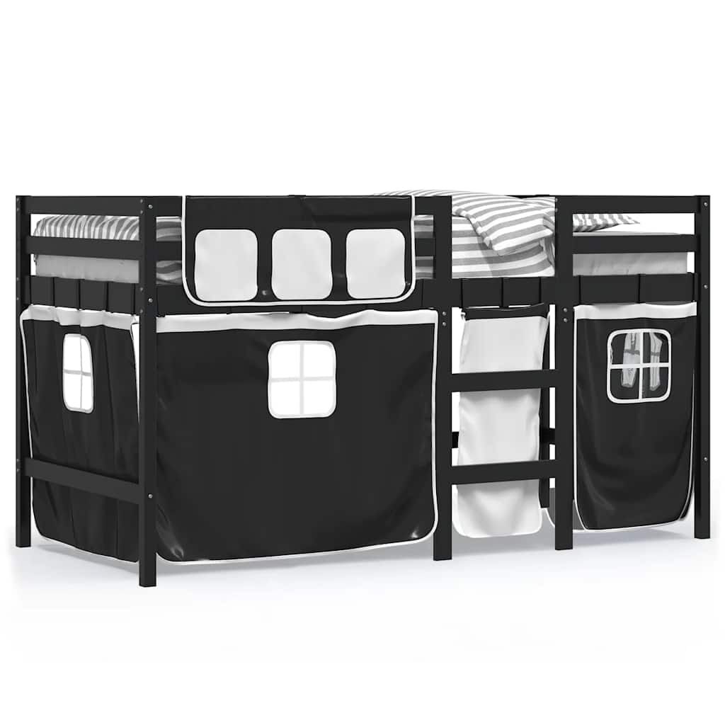 vidaXL Cama alta niños con cortinas madera pino blanco negro 80x200 cm