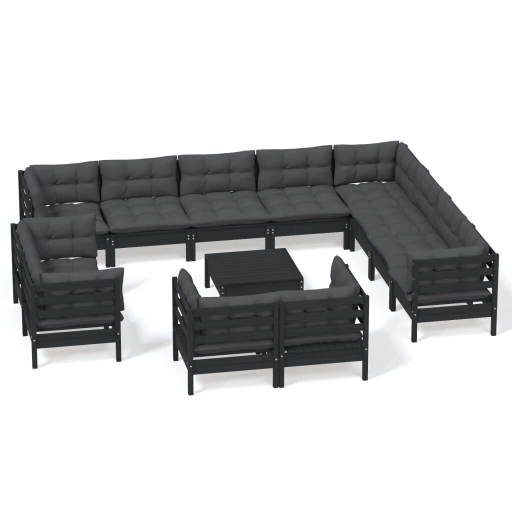 vidaXL Muebles de jardín 13 pzas con cojines negro madera maciza pino