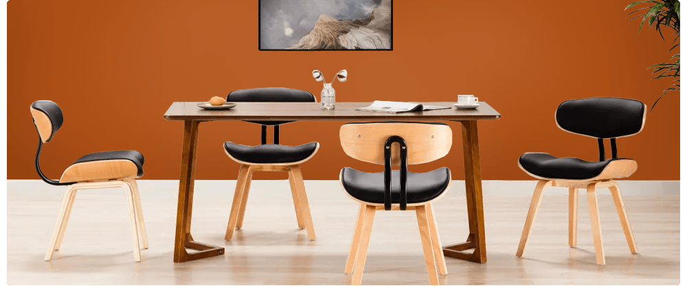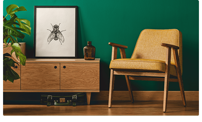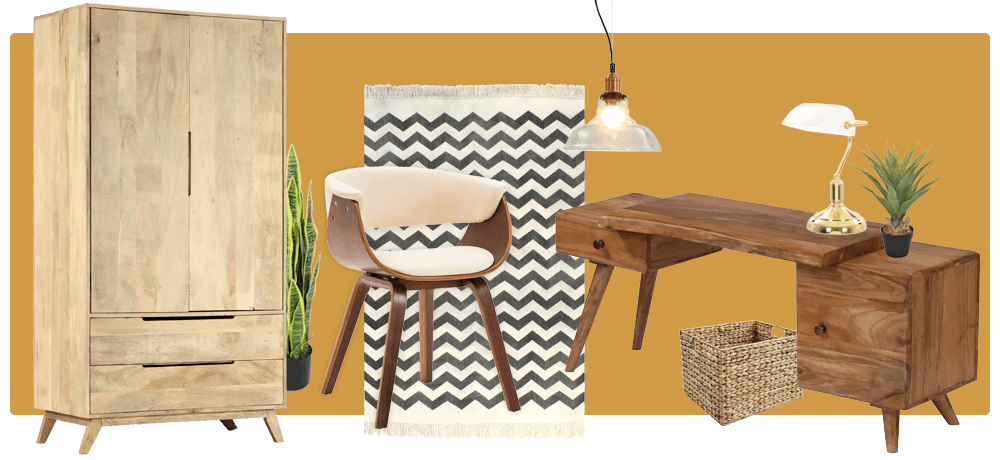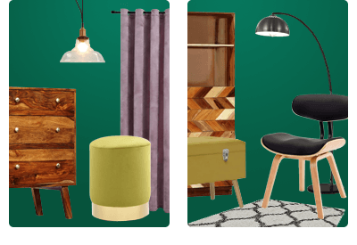 Algo que no puede faltar en un interior retro son las formas curvas y las líneas suaves en muebles y accesorios. Los muebles retro también se pueden reconocer por sus patas cónicas y el uso de madera. La madera oscura y clara se pueden usar en la misma habitación. Los materiales que se ajustan al estilo de diseño interior retro son madera, ratán, plástico, corcho, yute, lana y terciopelo.