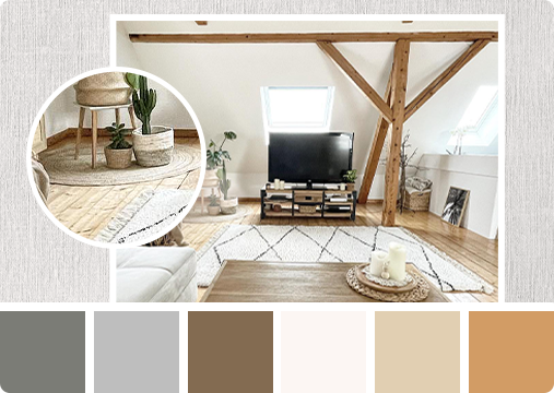 Piensa de forma natural, silenciosa y cómoda. La paleta de colores rústicos utiliza blancos cálidos, grises suaves y tonos de madera natural.