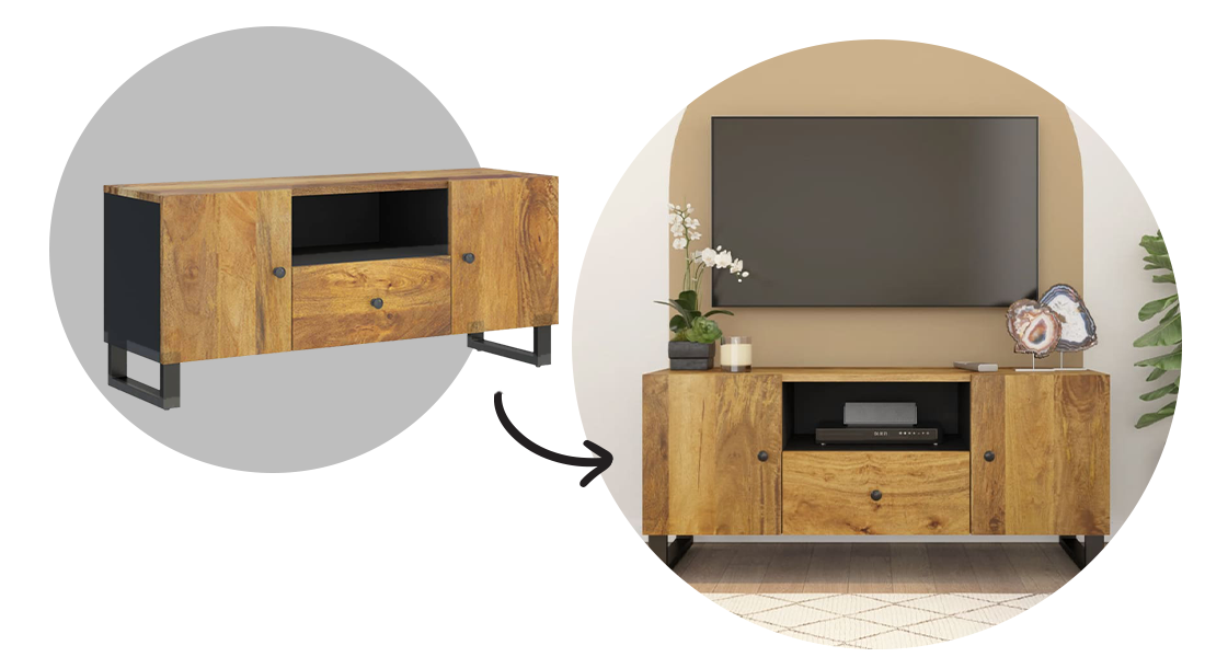 ¡Mezclar texturas es una necesidad de decoración! Mezcla puffs tejidos, mantas y un mueble de TV de madera reciclada, por ejemplo. Añade profundidad e interés a tu espacio. Capa de distancia!